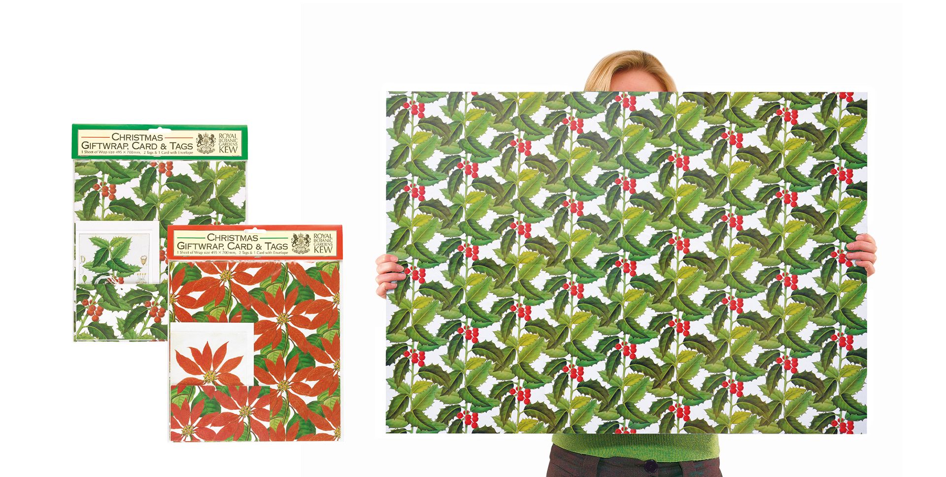 Cultivating ideas: Christmas giftwrap packs for Roval Botanic Gardens, Kew. Single cutout images were repeated to create the poinsettia and holly designs for packs with folded wrap, card and tag. Concept, design & artwork