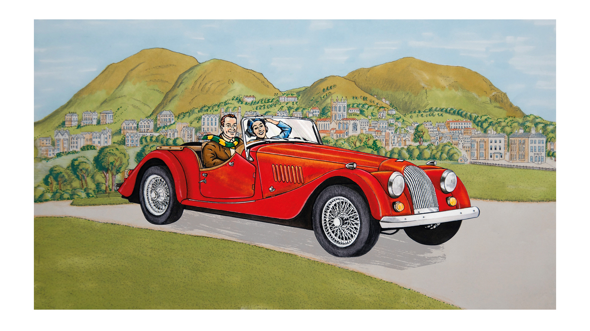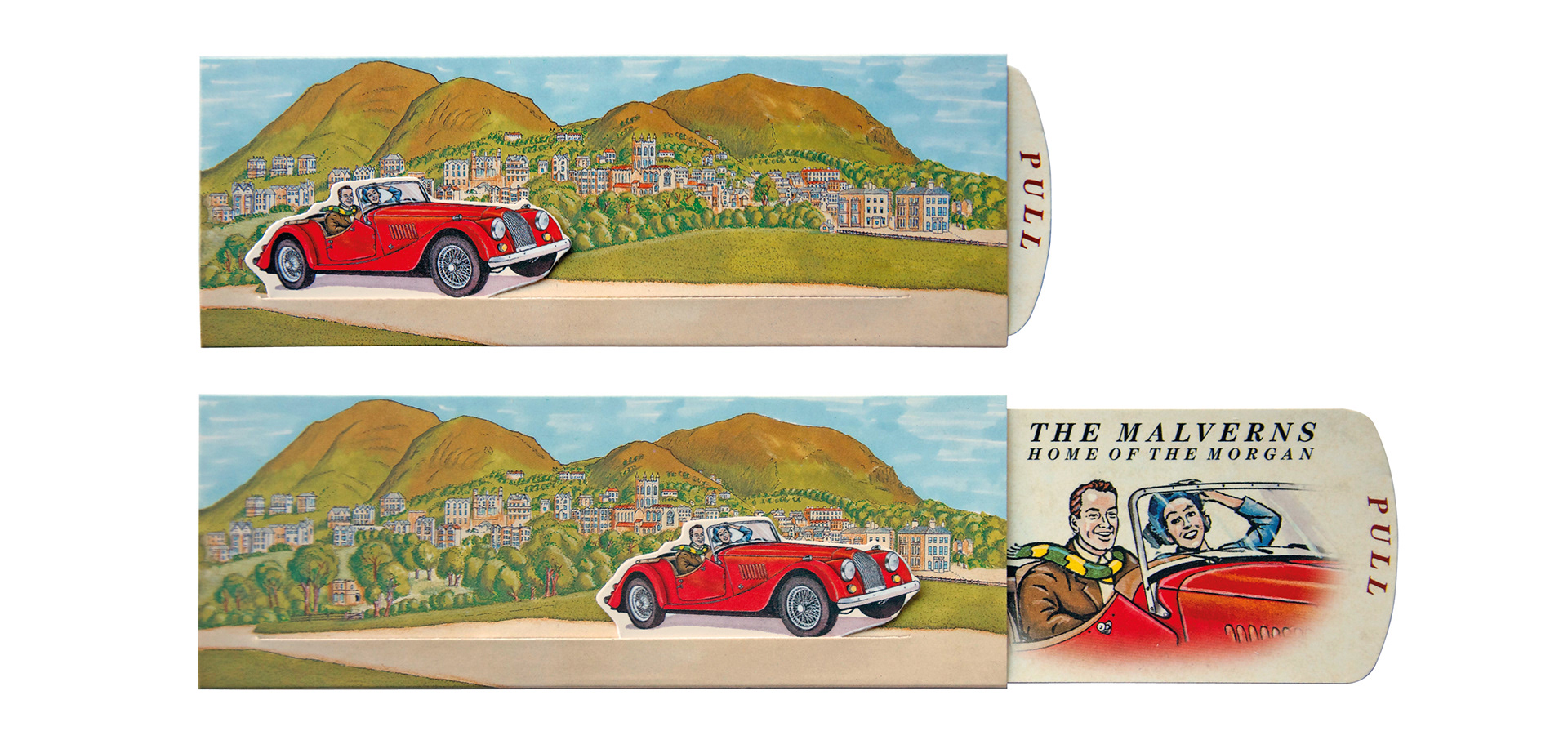 Illustration of a Morgan car being driven through Malvern produced as a moving bookmark tourism promotion.