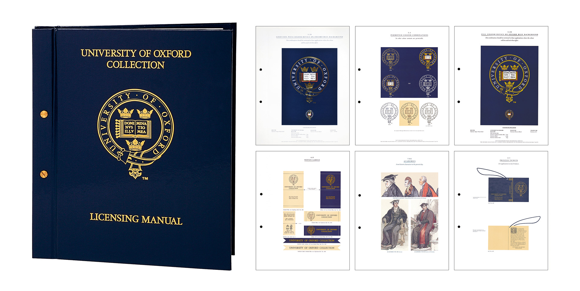 In preparation for the launch and development of a brand licensing programme for the University of Oxford belted trademark, the brand needed consolidating and refreshing. I was involved as the designer at Superior working closely with the team at Oxford Limited (a subsidiary company of the University of Oxford) designing the following projects: 1. Recreating the Official Device of the University of Oxford I created new artwork redrawing and refining the elements of the belted device trademark to create the new official registered Device of the University of Oxford (Many inconsistencies in the brand and poor quality versions of the device, plus unauthorised versions, had arisen across the immensely diverse institution with 45 colleges. 2. Device Variants Creating a comprehensive range of 8 colour variants of the device with 2 artwork versions for each modified to accomodate large and small size reproduction and colour requirements for a variety of different applications. 3. Redefining Oxford Blue Overseeing ink mixes with a colour lab and proofs to create the definitive Oxford Blue ink mix spec to be supplied to all licensees. 4. Proofing Document Creating the design and artwork for a comprehensive proofing document to evaluate the print quality of all the device variants across a variety of papers and print finishes including newspaper through to coated and uncoated board stocks, varnishes, mat & gloss lamination and the reproduction of the device in full colour, foiled and spot uv versions. 5. Brand Licencing Manual I did all design, layout, development and artwork for the brand licencing manual for the University of Oxford Collection. I created a design comprising of hinged covers, 43 leaves and held together using exposed brass screw posts so it could be updated. I sourced a traditional bookbinders and had the manual hand bound and foiled. The manual contains guidelines for the correct application of the visual identity onto commercial products and focuses on the Oxford University belted arms device trademark. Sections include: Policies and procedures, The registered Device, Approved colour palette, perforated swatches, Woven and printed labels, Product packaging, Typefaces, Approved design concepts, perforated colour swatches & samples. 6. Collateral Materials Design for an assortment of labelling, tags, POS material. 7. Official University of Oxford Collection Range Design for a range of retail stationery products specially commissioned to carry the University’s device.